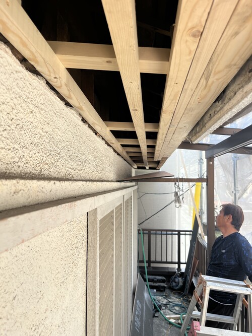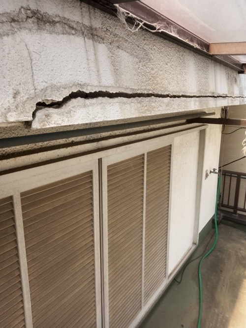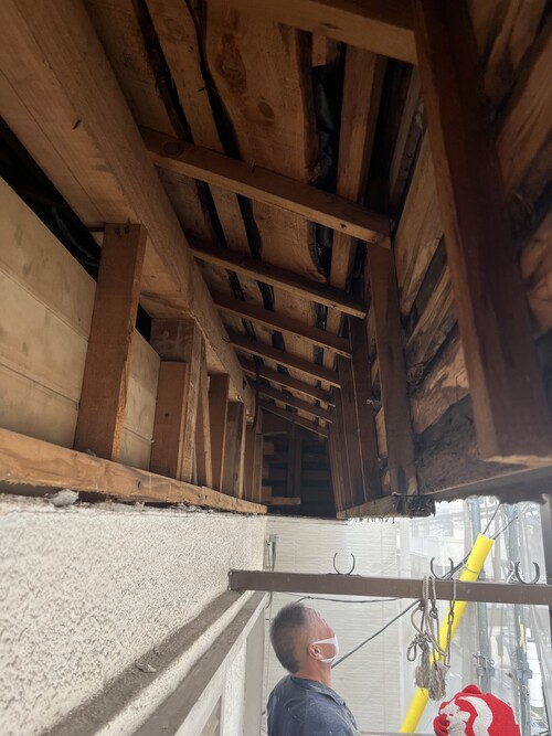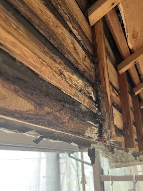 屋根から水が回り中の木材が腐っていたため、モルタルの重みに耐えきれず壁が割れて落ちかけていました