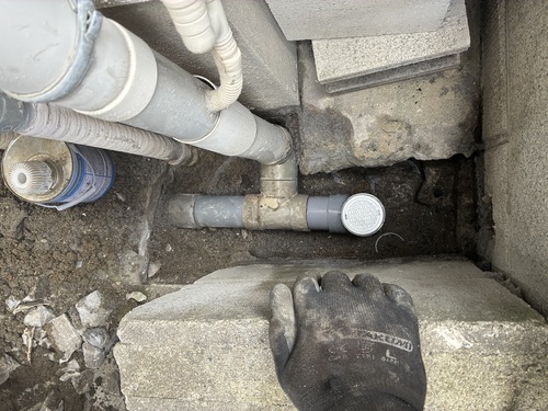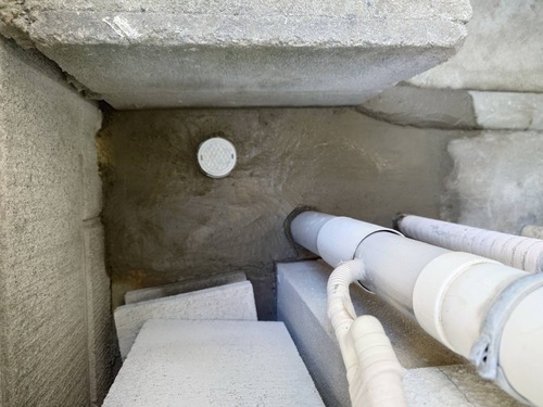 時折排水管の近くのブロック塀より、汚水が漏れ出てくる原因の調査依頼でした。雨水と汚水が同じ個所に流されており、また配管のつなぎ方に問題があったため水が逆流し、悪くなった接続箇所から汚水や雨水が流れ出てくるのが原因でした。