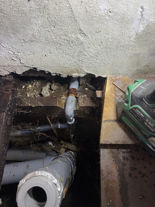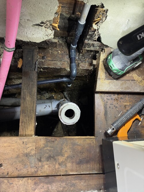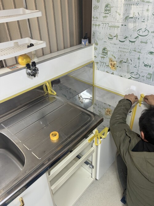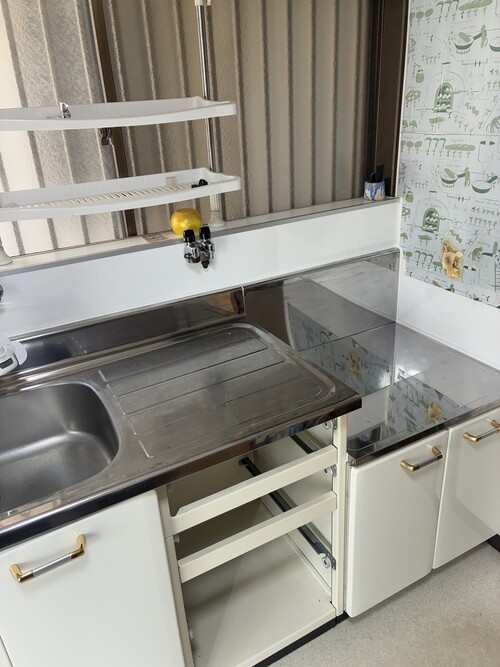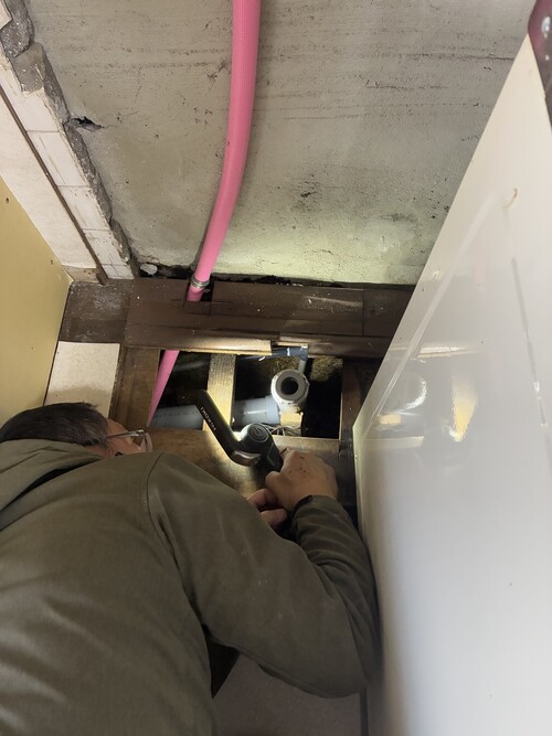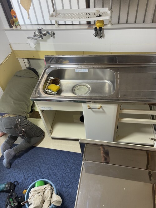 キッチンの裏側の外壁から水が染み出ており、漏水が発覚。キッチンと外し調査。原因箇所が判明したのでそのまま修繕し、キッチンを復旧しました。