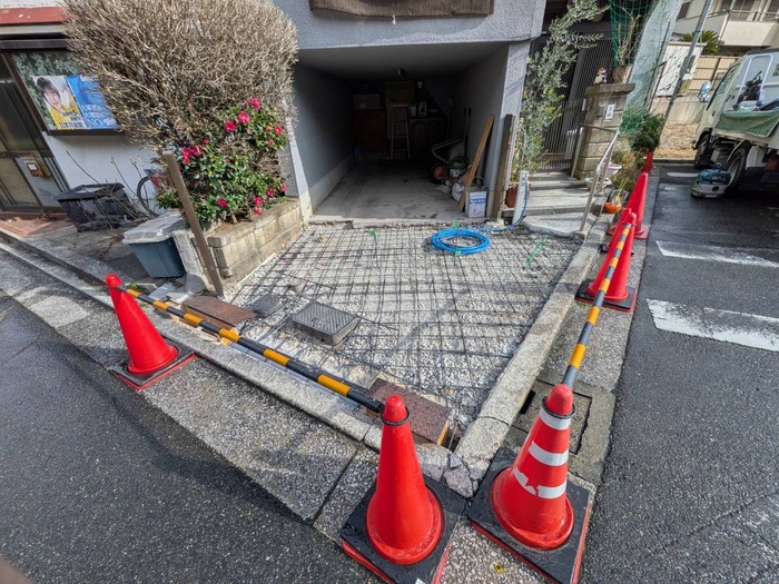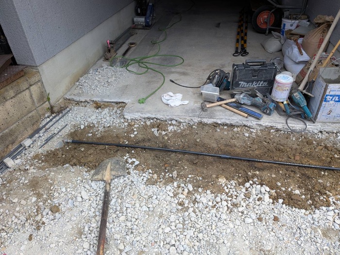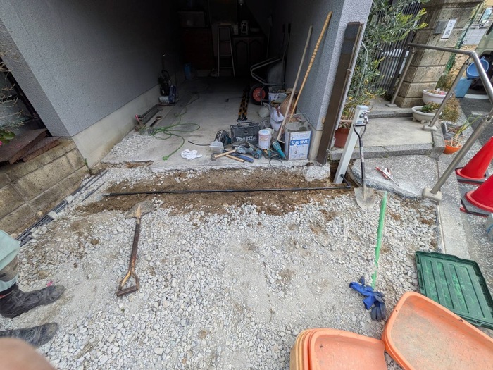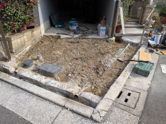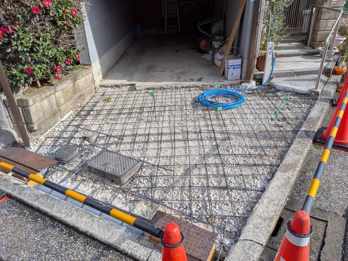 コンクリートの下の強度不足のため、車の出入りをすることで割れが発生していました。いったん土間を撤去したあと鉄筋を入れコンクリートを打ち直ししました。合わせてご希望されていた立水栓を新設致しました